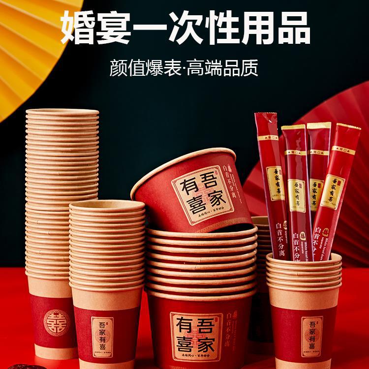結婚喜碗厚手の赤い丸い紙碗結婚式の酒席の碗の箸の披露宴用紙コップの使い捨て食器セット