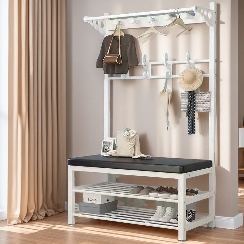 玄関に着席可能なコートラックとシューズキャビネット、壁掛け式洋服ラック、玄関用帽子ラック、ソフトバッグスツール、バッグラック