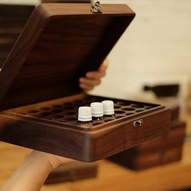 木制エッセンシャルオイルボックス分格丸穴展示ボックスカバー式口紅収納整理ボックス黒胡桃多格エッセンシャルオイルボックス