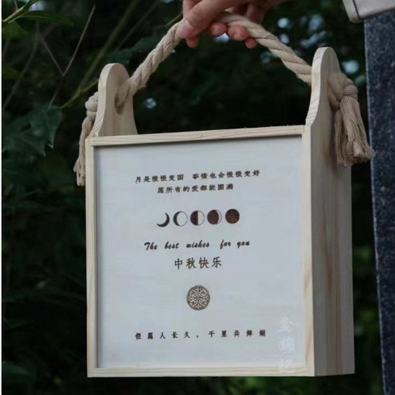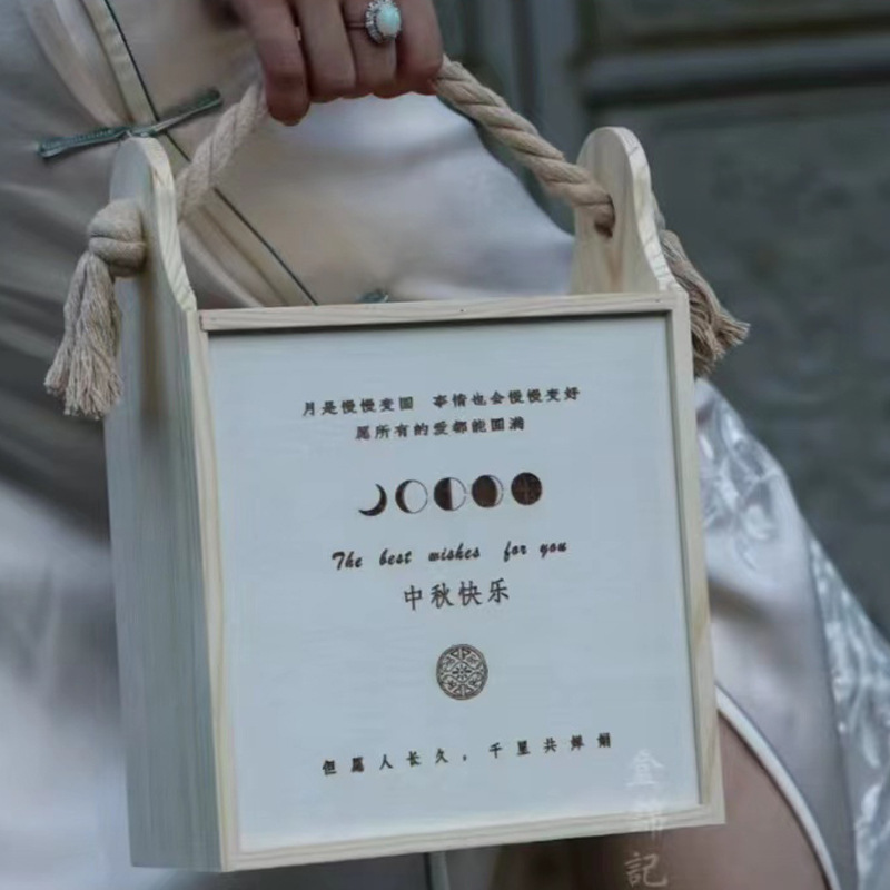 木质中秋节日礼品创意麻绳手提式包装盒抽拉式木盒收纳盒空盒