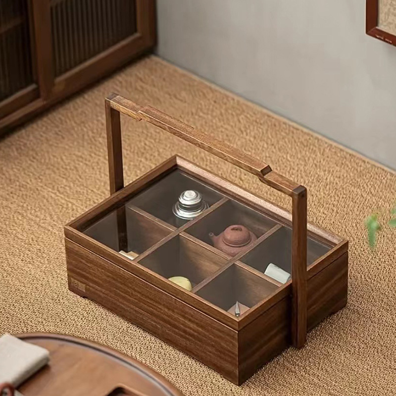 胡桃木茶器手提げケース実木分格収納木箱家庭用茶器収納ケース新中国式菓子バスケット