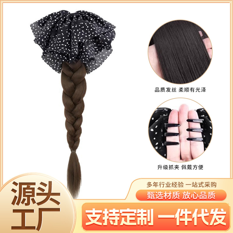 女性用人工毛三つ編みクリップ、フレンチ白黒水玉模様のリボン編み込み、ロング三つ編み、新しい中国風ヘアアクセサリー、ポニーテール