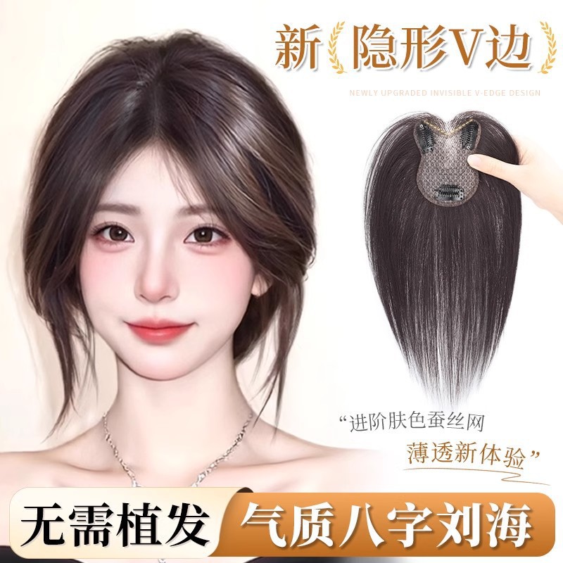 女性用ウィッグ、薄手の手織り額、白髪を隠すエッジレス、目に見えない自然で通気性のあるV字型福袋ネットヘアピース