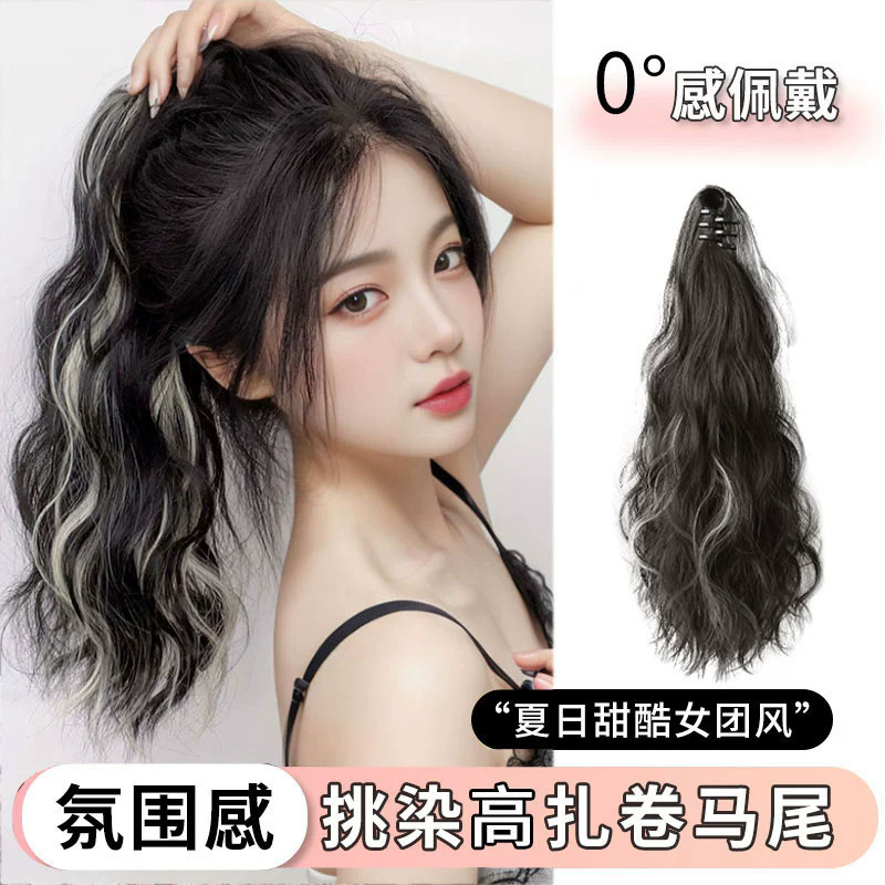 女性用ハイライトポニーテールウィッグ、クラウドパーマ、ハイブレード、おしゃれなヘア、ふわふわクリップ、カラフルな水の波紋、梨の花カーリング