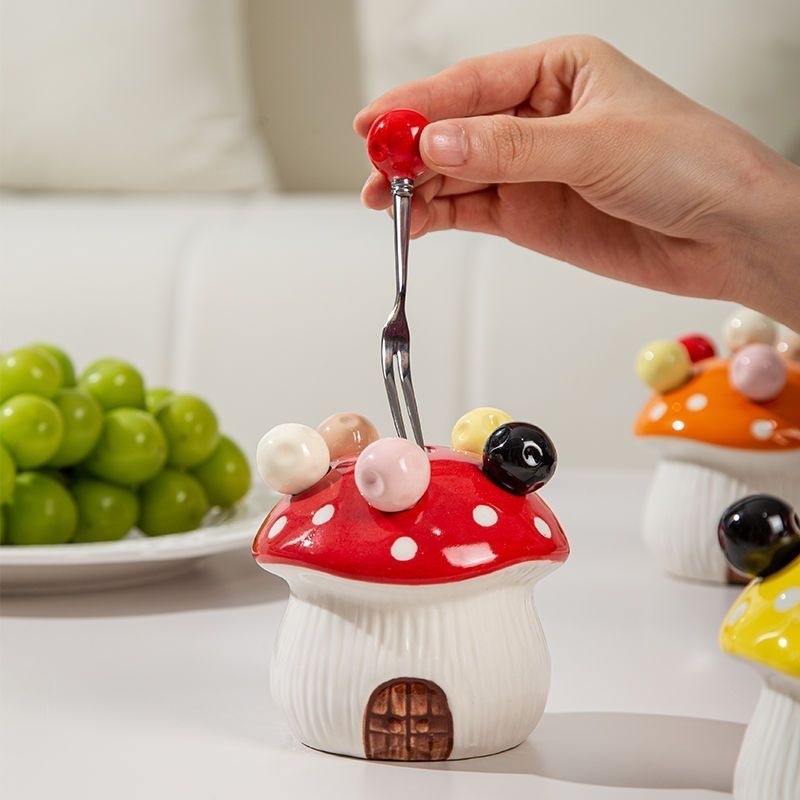 新しい家のエクスプレスフルーツフォーク100本、キノコハウスの形、かわいいリビングルームの卓上装飾品、デザートフォーク、ケーキフォーク