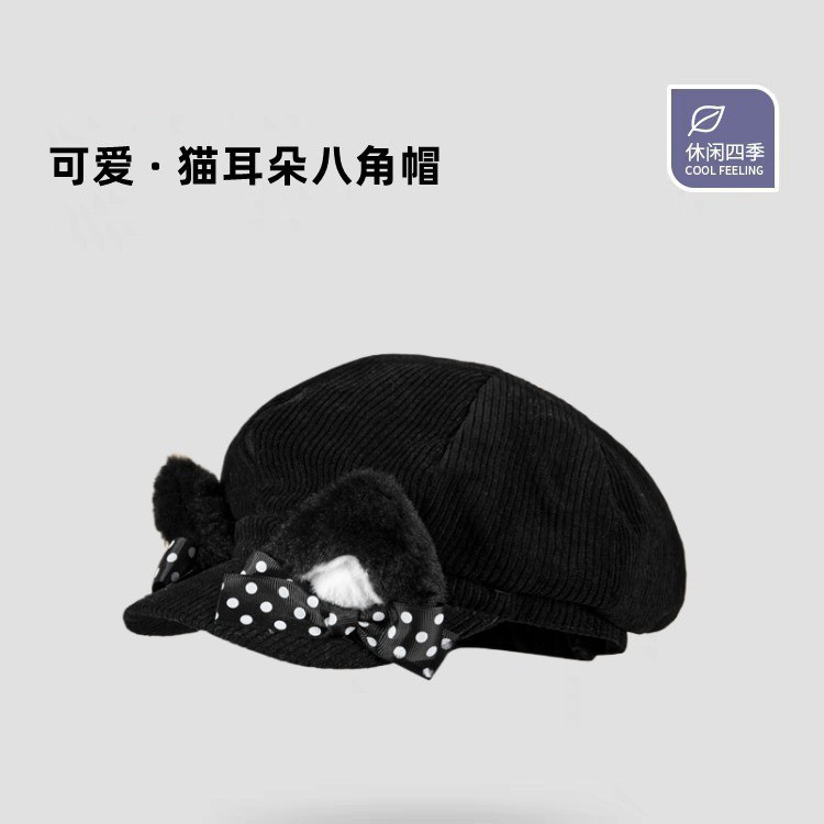 オリジナルのかわいい猫の耳のコーデュロイの八角の帽子の女性の秋冬の日系の百合の顔の小さい千鳥の格のベレーの帽子