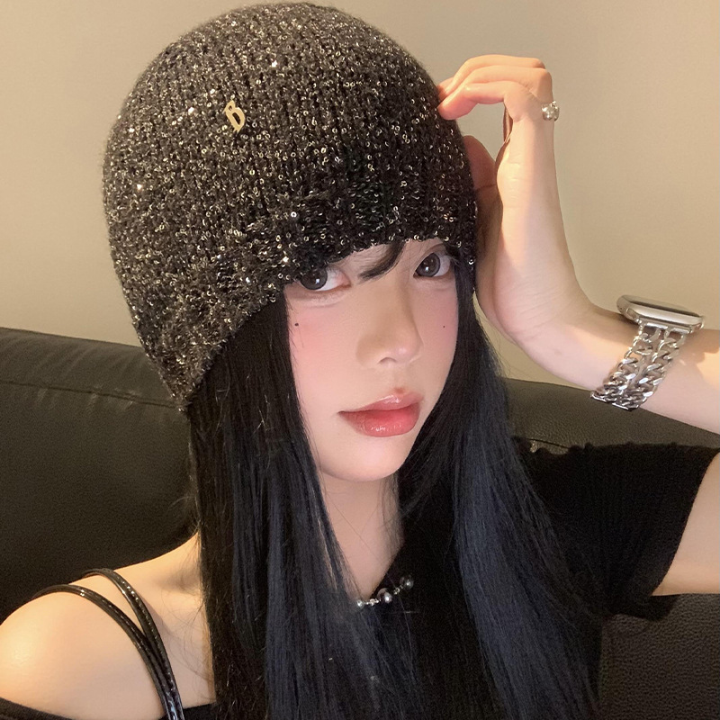 小香風亮片包頭帽女2024新ins百合顕顔小冷帽ギャルメリヤス山帽子
