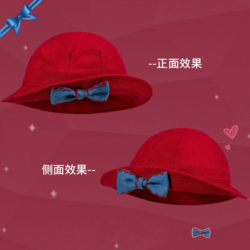 かわいい小さい子供の蝶結びの赤い漁師の帽子の女性の甘い美しさは顔の小さい盆の帽子を現します。
