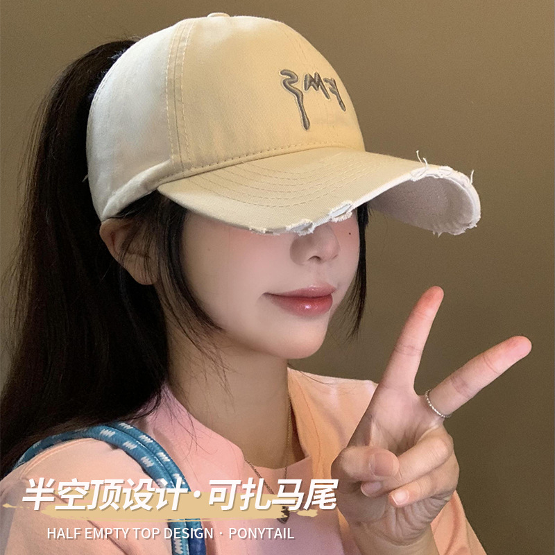 ポニーテールの空っぽ野球帽の女性が穴を割って古い大きな頭の周りのアヒルの舌の帽子の広いつばを作って顔を見せます。