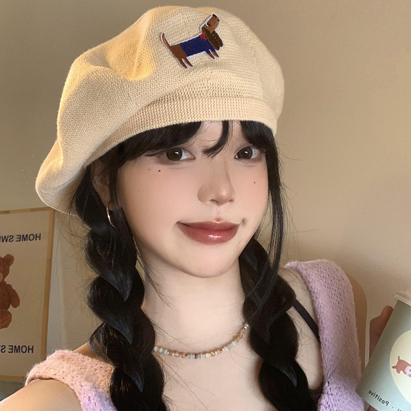 韓系のかわいい子犬の刺繍のベレー帽の女性の春秋の金の百合の大きい頭の周りの画家の帽子は顔の小さいニットの帽子を現します。