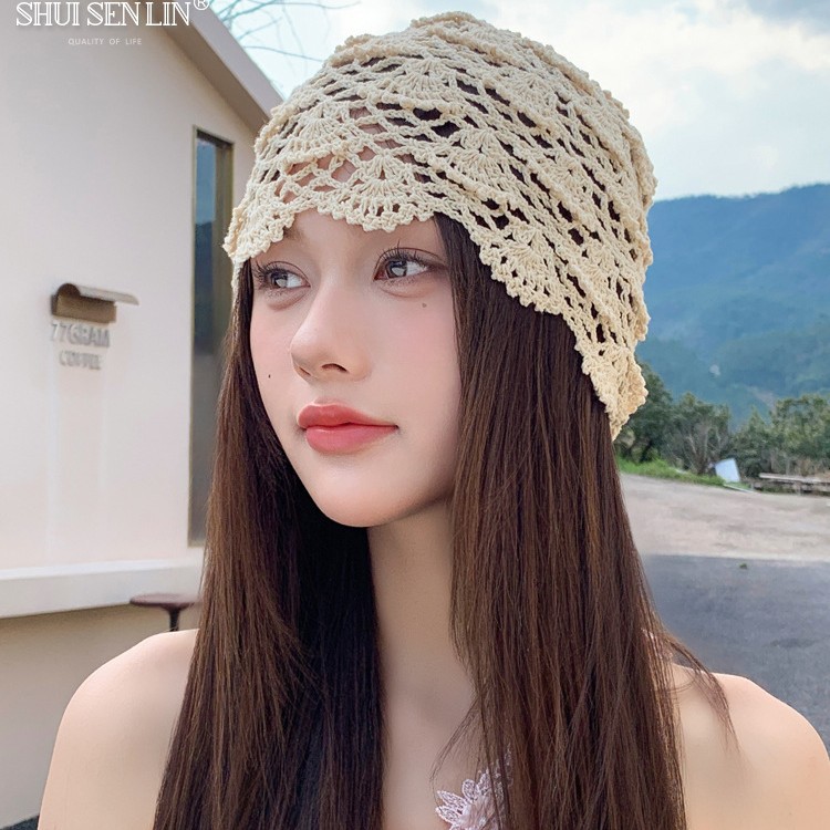 春夏の薄い中空手編みかぎ針編みニットパイル帽子レディースファッション多用途包頭帽子ターバンレース帽子