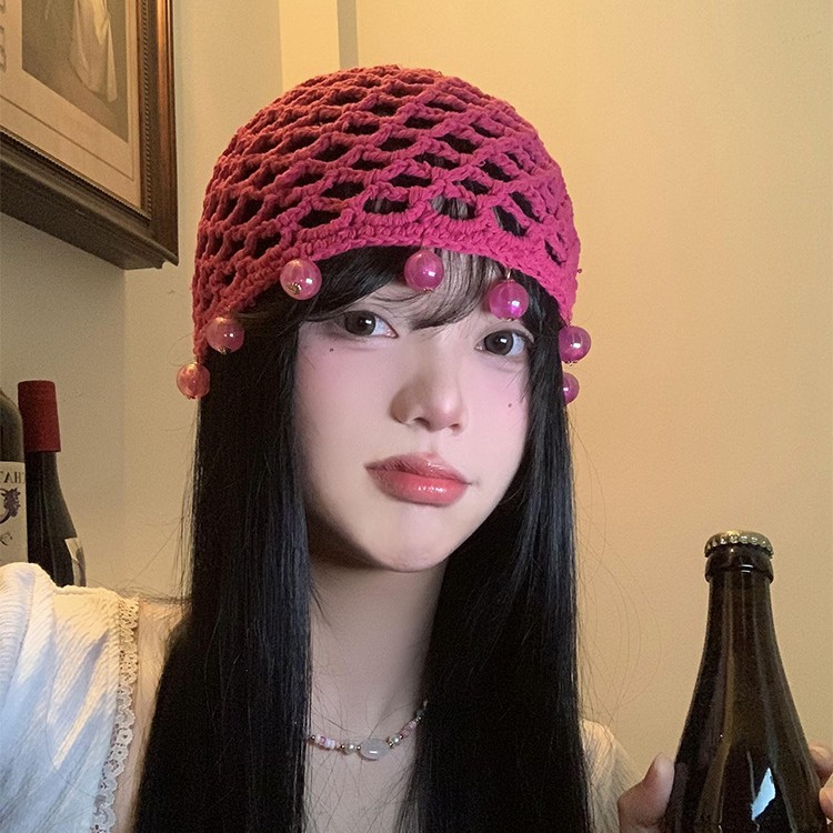 女性用の手織り中空ビーズつば帽子、レトロで多用途、顔が見える小さなプルオーバー帽子、ボヘミアンニット帽子