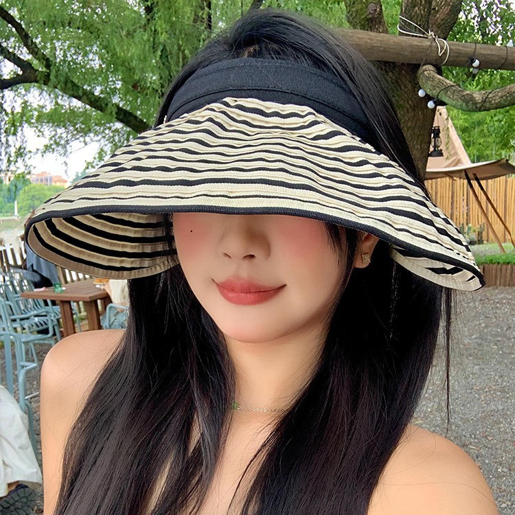 黒と白のストライプの大きなつばの顔が見える小さな中空帽子女性の夏の抗 UV 日焼け止め日よけ顔を覆う日よけ帽子