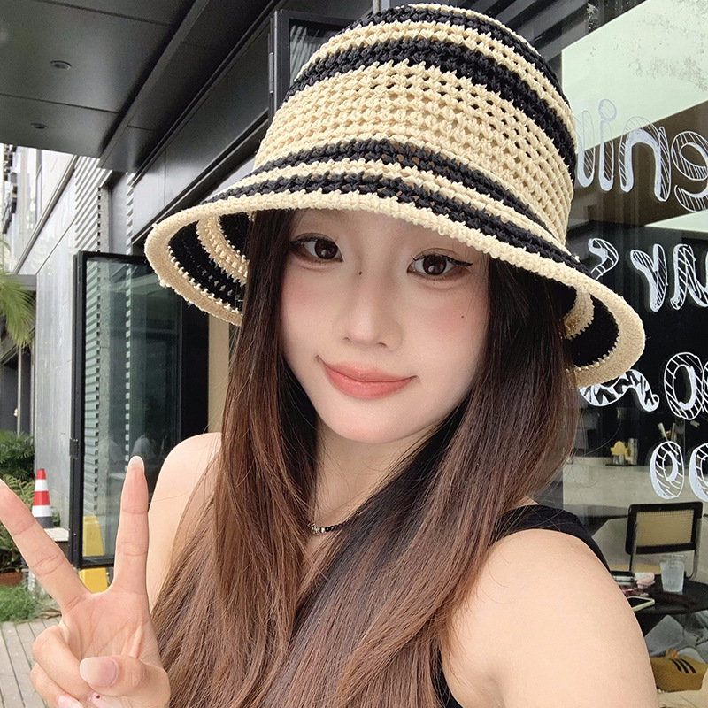 日本製わらストライプ漁師帽子女性用 2025 新しい夏中空通気性顔見せ小さな盆地帽子日焼け止め帽子