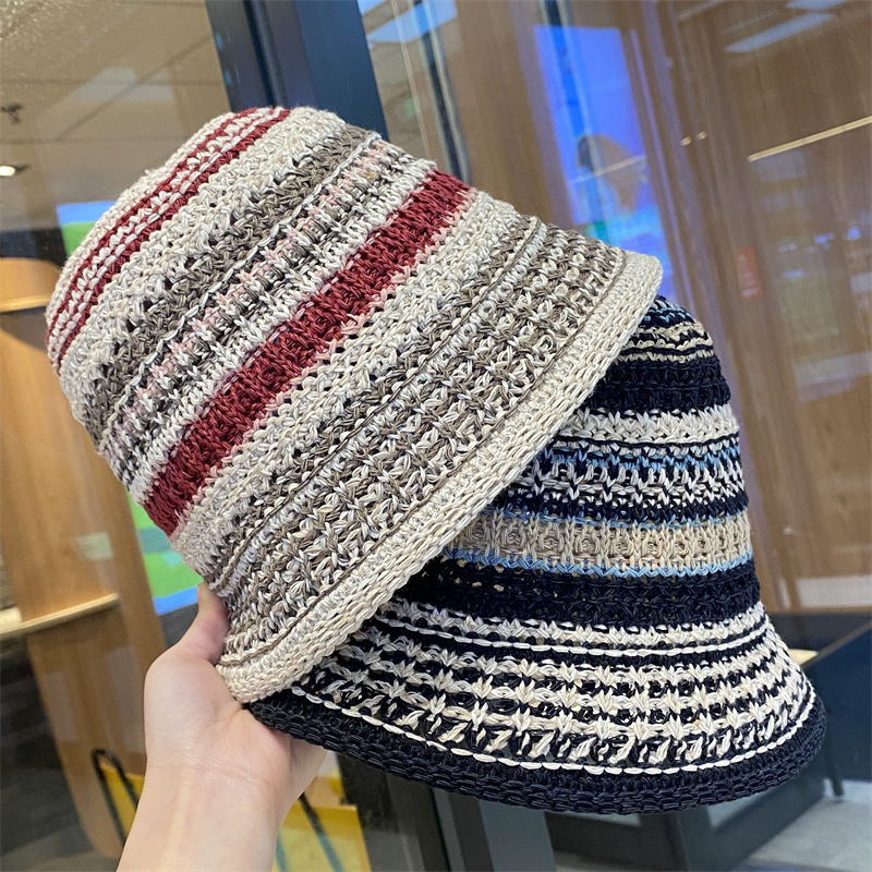 カラーブロックストライプ織りフィッシャーマンハット、春夏万能バケットハット、顔が見える小さな日焼け止めサンハット、女性用の新しいスタイルの帽子