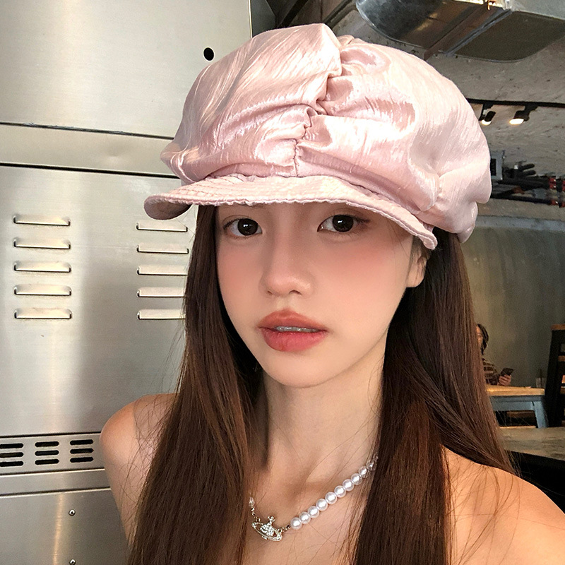 ピンクサテンプリーツベレー帽女性のための夏 2025 新しい韓国薄い雲八角形帽子ファッション画家帽子