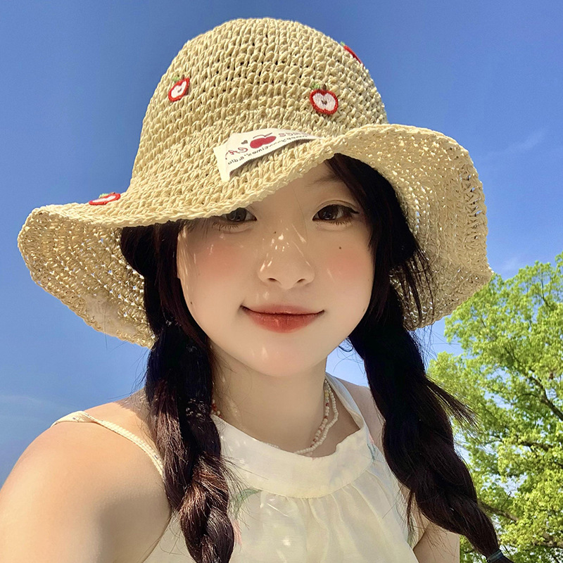 リトルアップルパッチ中空麦わら帽子女性の夏の海辺のビーチ休暇帽子大きなつば日焼け止め漁師帽子