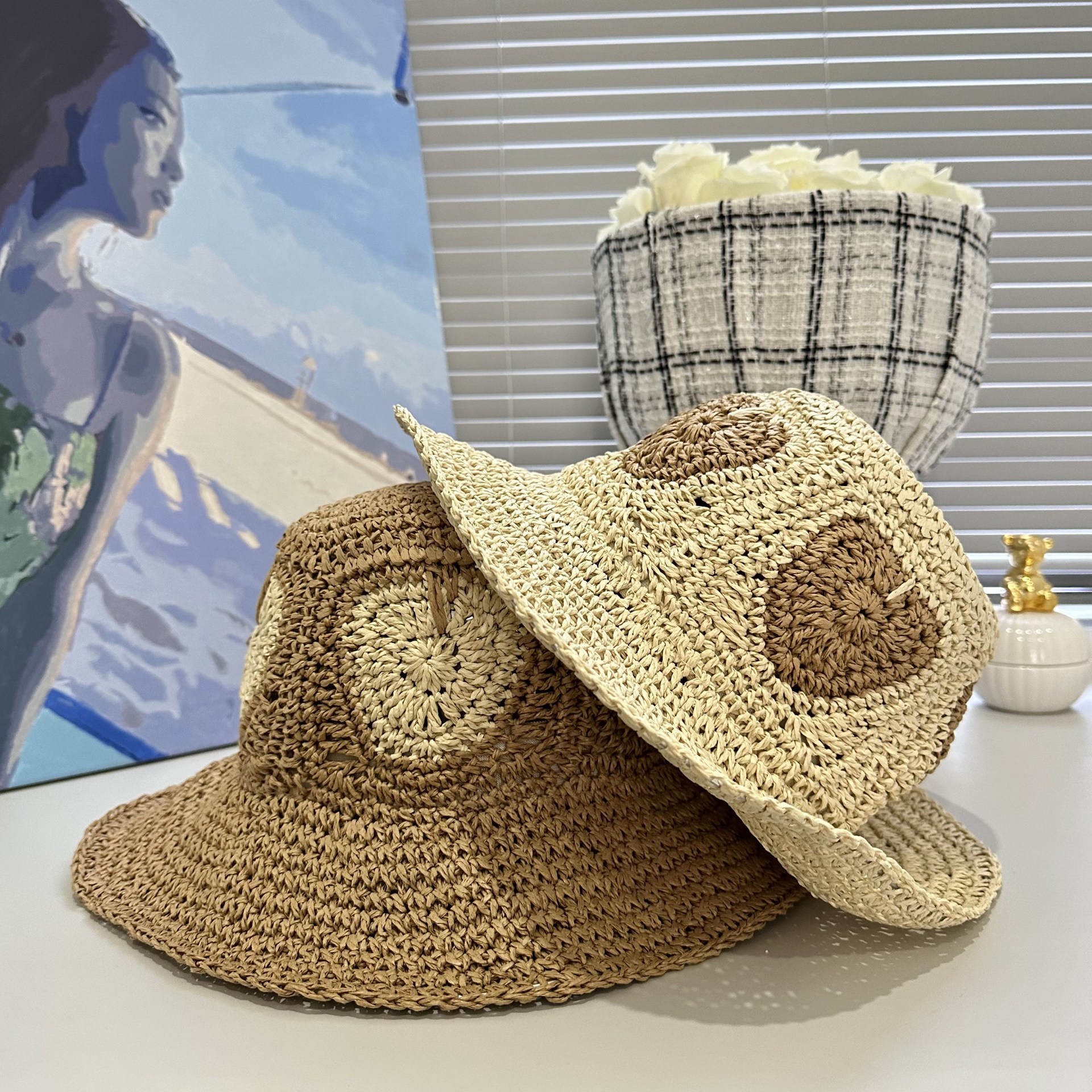 姜妍同モデルの草編空頂日焼け止め帽子子供夏の海辺の休暇日よけ帽子の大きなひさしは太陽の帽子を畳むことができます。