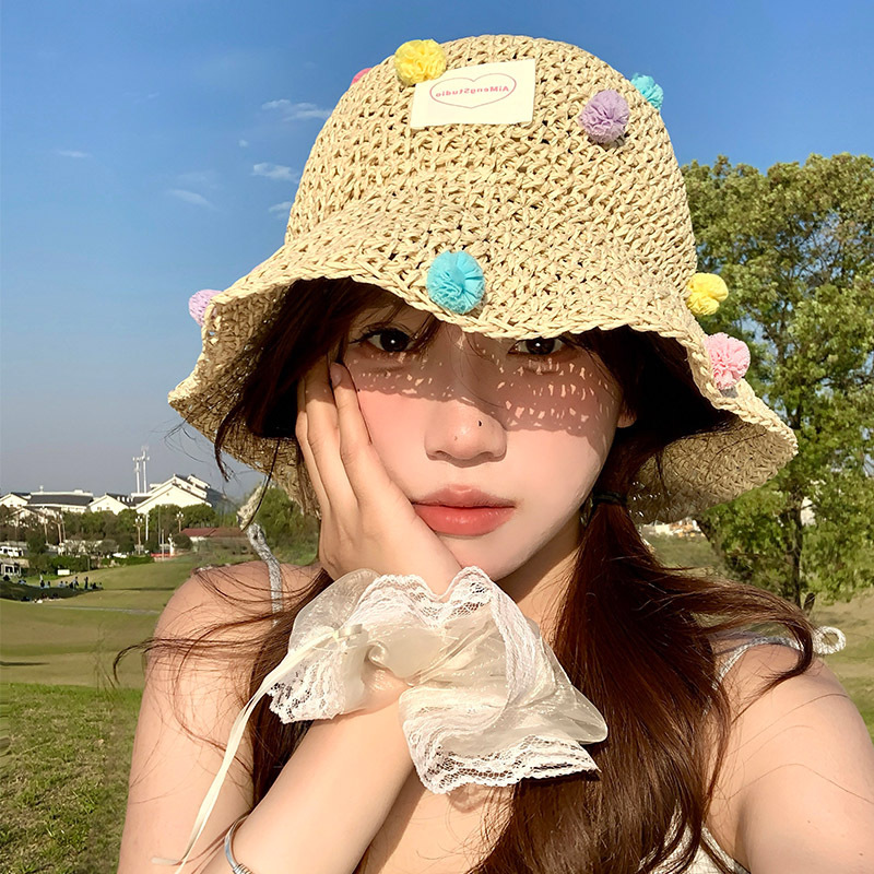 ドーパミンカラーボール草編み漁師帽女性夏2025新作旅行日よけ大つば日焼け止め麦わら帽子