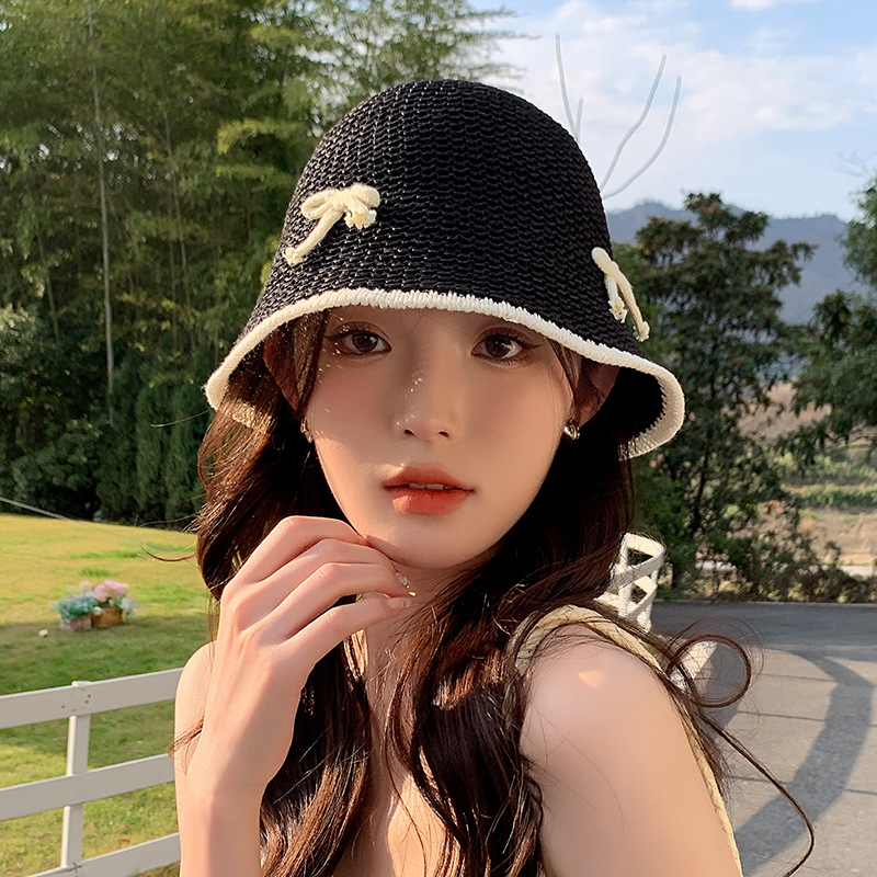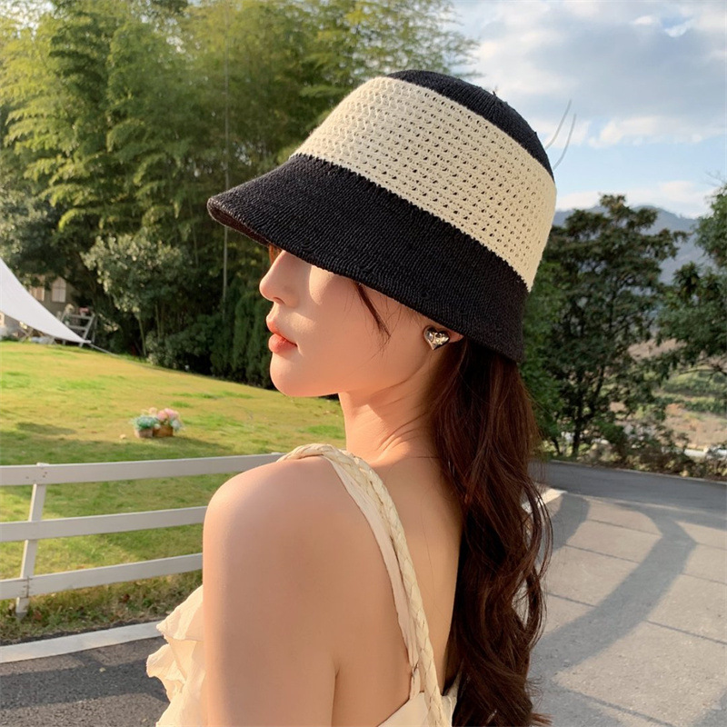 ニット漁師帽子女性の夏 2025 新しい中空バケットハット蝶結び薄型多用途通気性サンシェード帽子