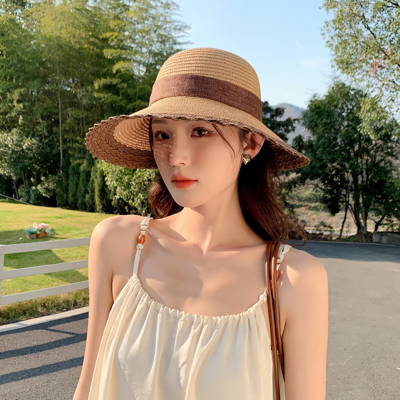 カラー草編み漁師帽女性夏の日系顔が小さい麦わら帽子ビーチ日よけ日焼け止め太陽帽子潮