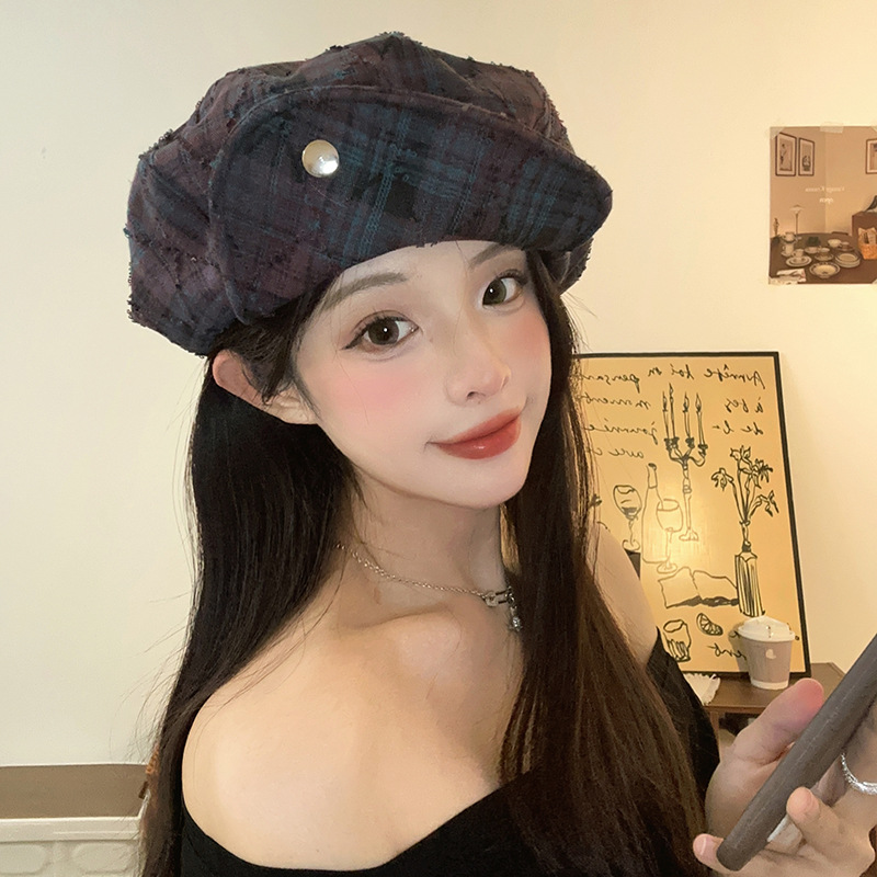 レトロなダメージ加工チェック柄ベレー帽レディース英国風ニッチつば付き万能ペインターハット新しい顔見せ小さな八角形帽子