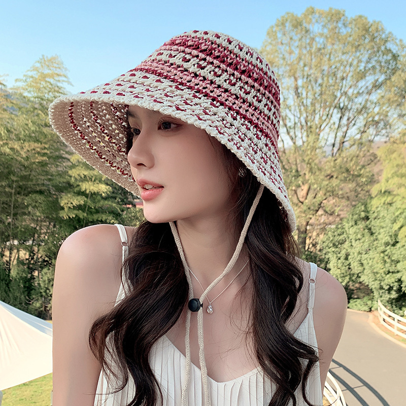バケットハット女性のための春と夏 2025 新しいニット中空コントラストストライプ漁師帽子屋外多用途日よけ帽子