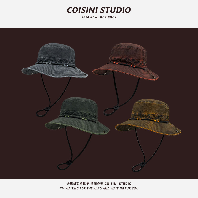 日系水洗いカウボーイ漁師帽女夏2024新カジュアルな毛の縁の大きなつばに顔の小さな盆帽が湿っている