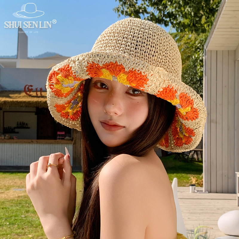 パンパン雅風花刺繍麦わら帽子漁師帽女春夏大つば日よけ日焼け止め帽子海辺折り畳み可能