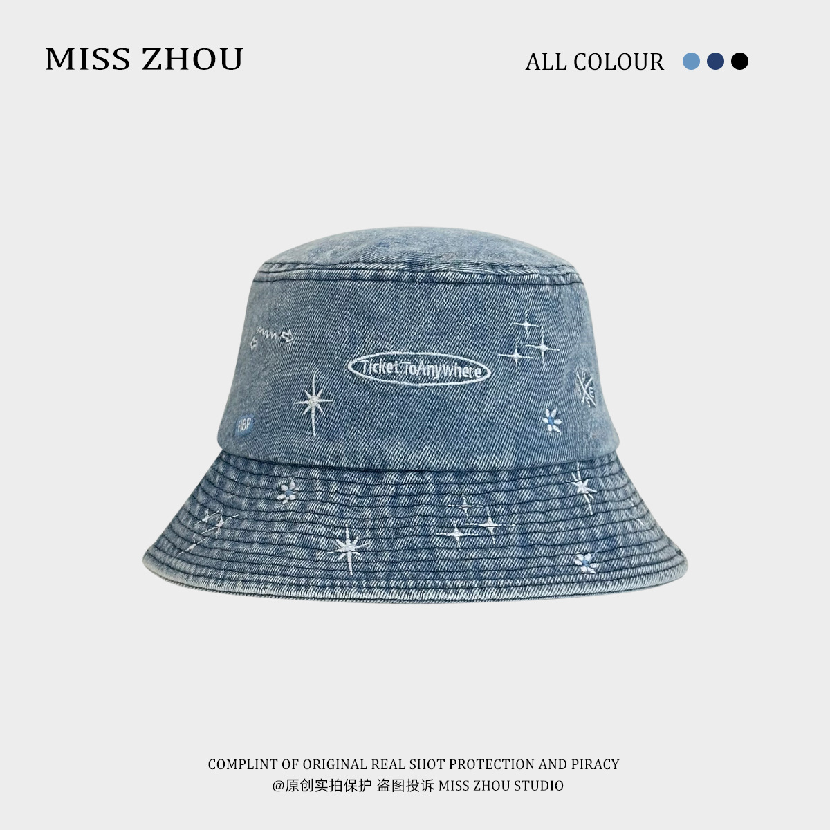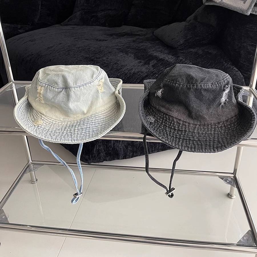 レトロな水洗いは古い蝶結びのデニムの漁師の帽子をします。