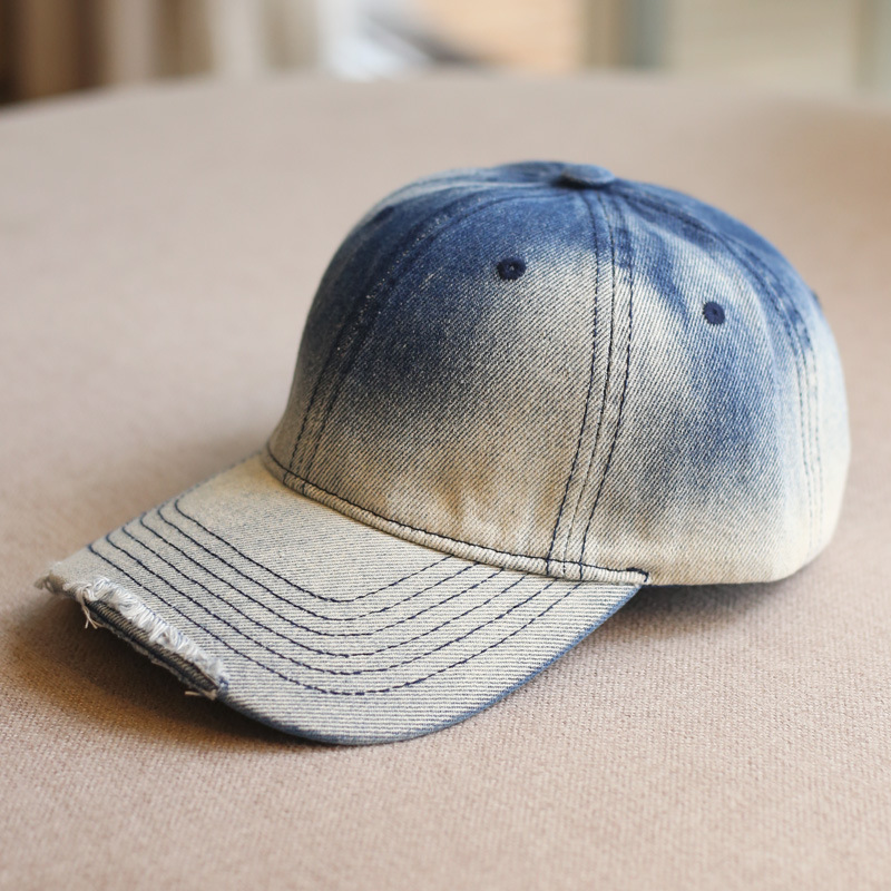 水洗いデニムの穴を割って野球の帽子を染めます。