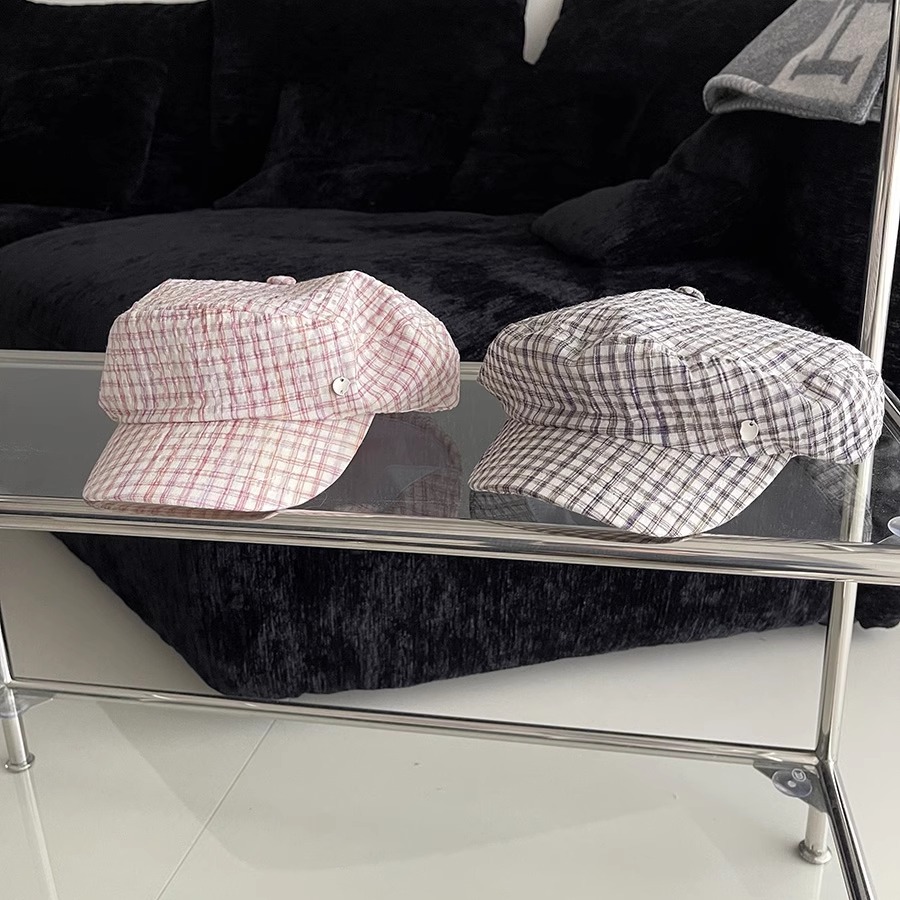 韓国版のレトロな格子縞の百合文芸大版は顔のアヒルの舌のベレー帽の女性の春夏の薄い金の雲の画家の帽子を現します。