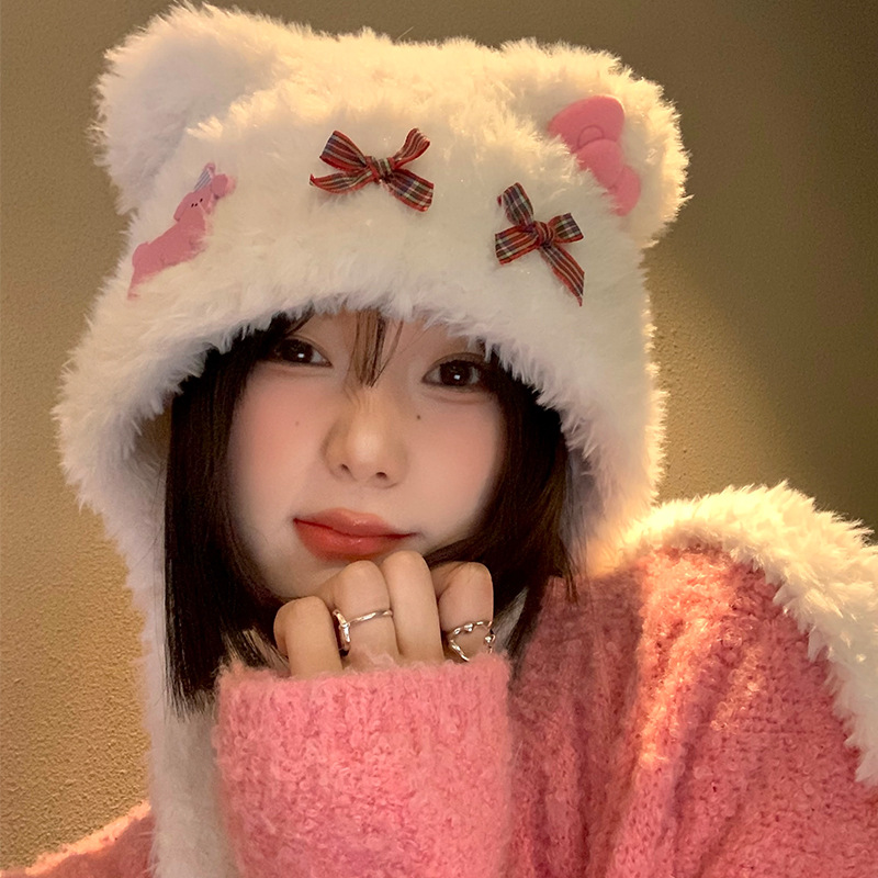 帽子の女性2024の新しい甘くてかわいい秋冬のぬいぐるみの猫の耳の耳の耳のカバーの帽子の保温の防寒のニットの帽子