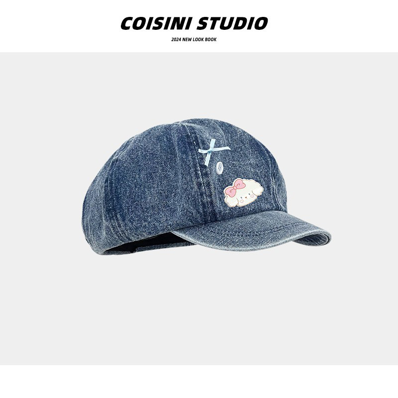 甘くてかわいい子犬の水洗いデニムのベレー帽の女性のレトロな大きい頭は雲の帽子のギャルのy 2k画家の帽子を囲みます。