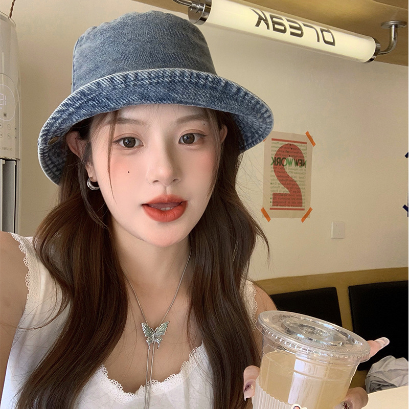 日本系レトロ水洗いデニム漁師帽子供春夏2024新型百合顔小日よけ日焼け止め盆帽