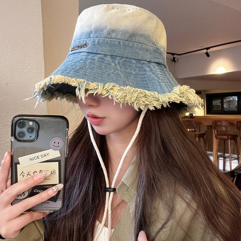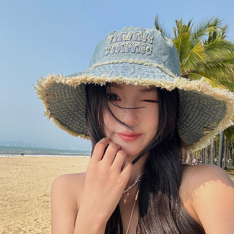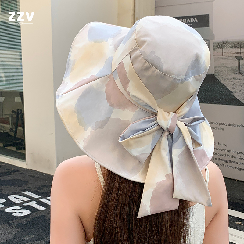 ビーチの海辺の蝶結びの漁師帽の子供2024項のファッション的な大きな軒の黒いゴムの日焼け止めの日よけの帽子の国風は墨をかけます。