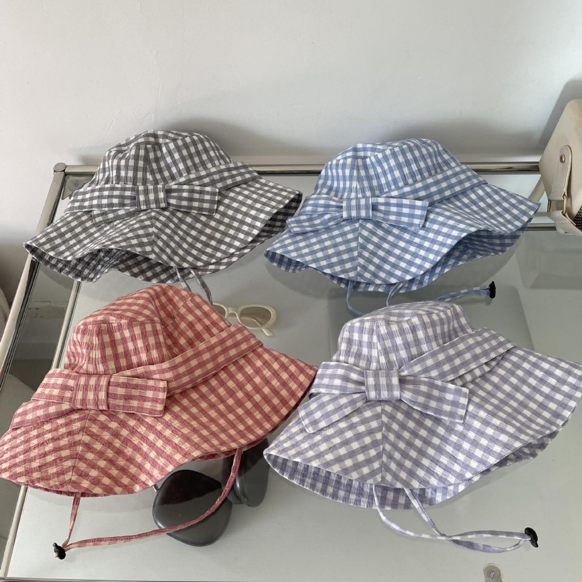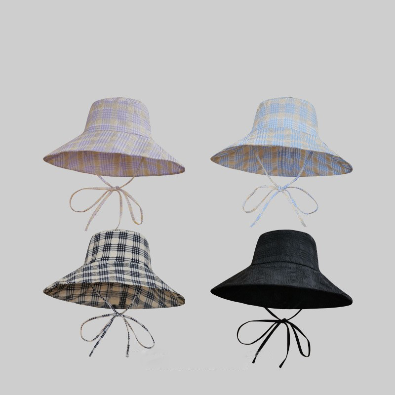 韓国のデザイナーの格子縞の日よけ帽子の女性insの蝶結びの平頂の漁師の帽子の大きいつばは顔の小さい盆の帽子を現します。