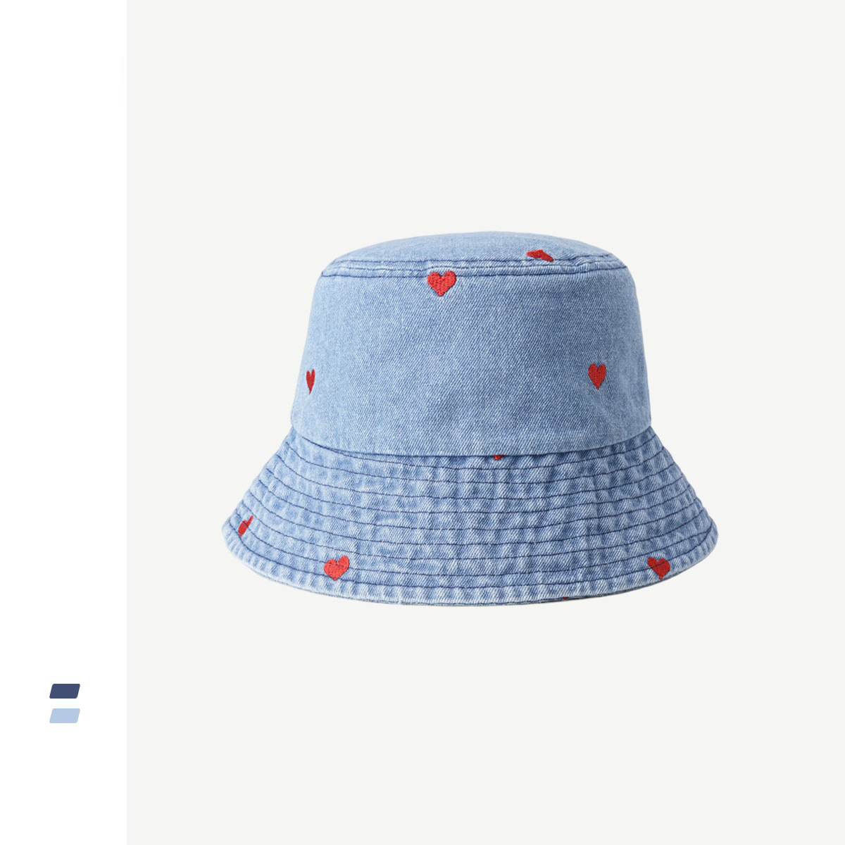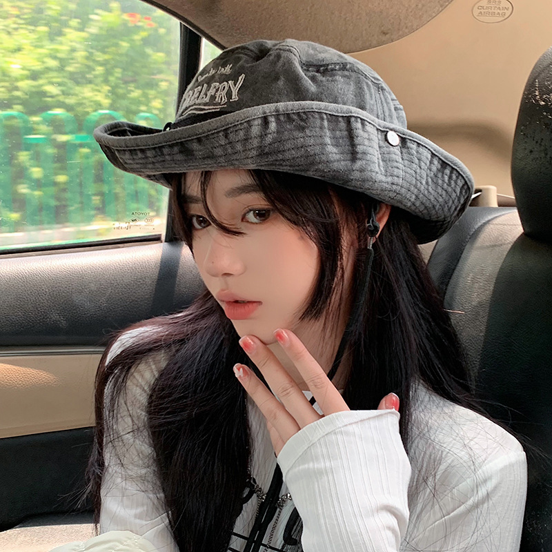 日本系ハート刺繍デニム漁師帽女性原宿レトロ香港風盆帽韓国版春夏日よけ帽子バケツ帽