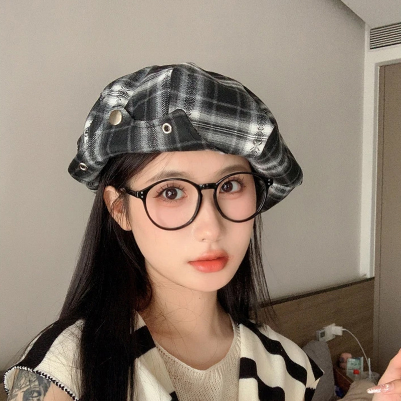 レトロチェック柄ベレー帽女性の春と秋の韓国スタイルの小さな八角形帽子 2025 新しい文学的で芸術的な画家の帽子