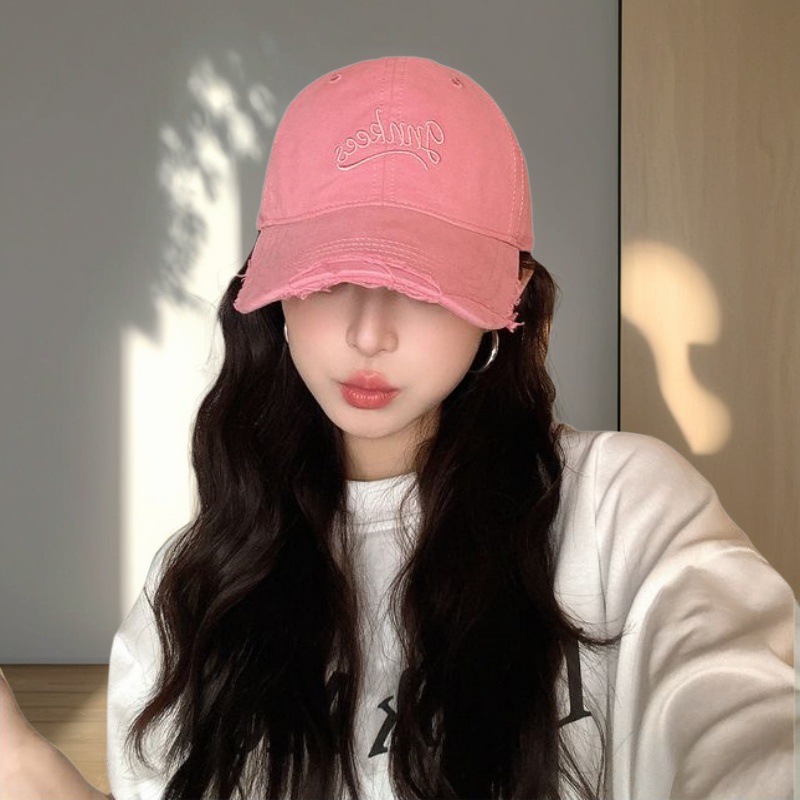 2025春のレトロな刺繍ピンクの野球帽の女性がつばを大きくして顔を見せます。