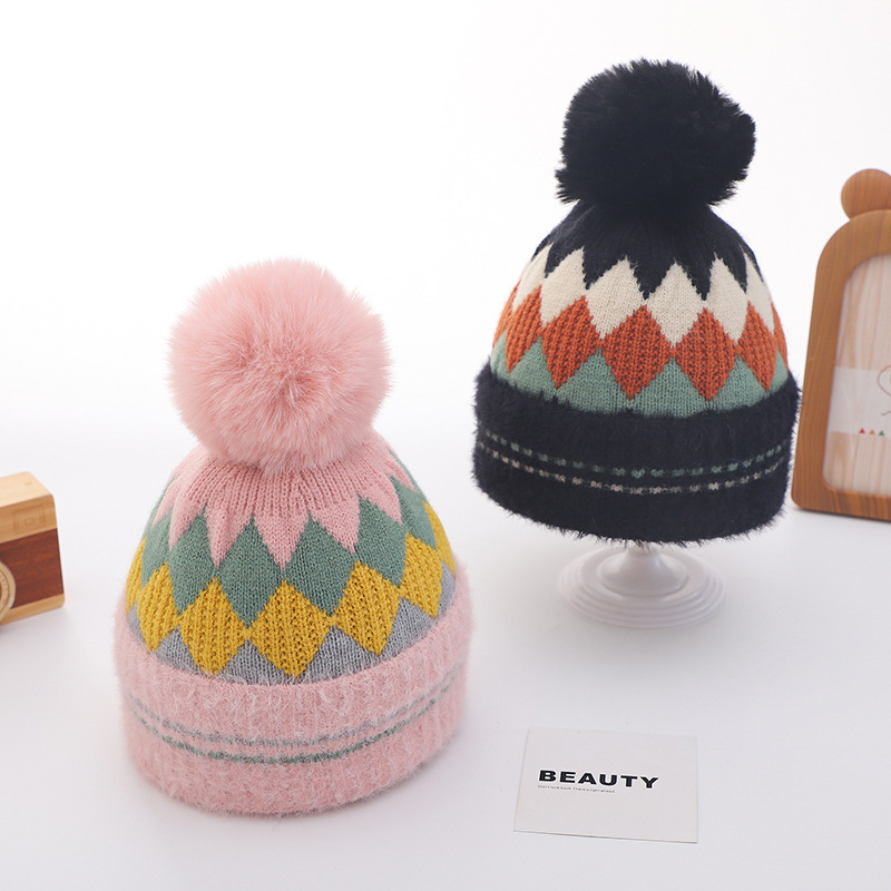 クロスボーダー速売通単角菱格子毛玉ニット帽冬児童ゲーリー保温毛糸帽児童カバー