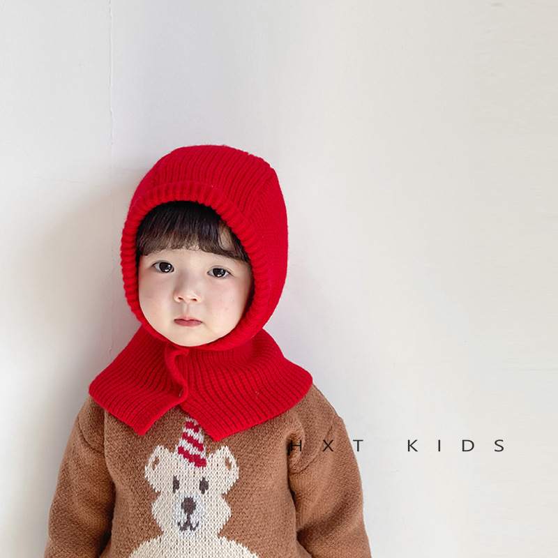 子供の帽子のマフラーの一体の帽子秋冬の韓国版はニットの耳の帽子の赤い洋気の赤ちゃんの肩の帽子の潮をかぶせます。