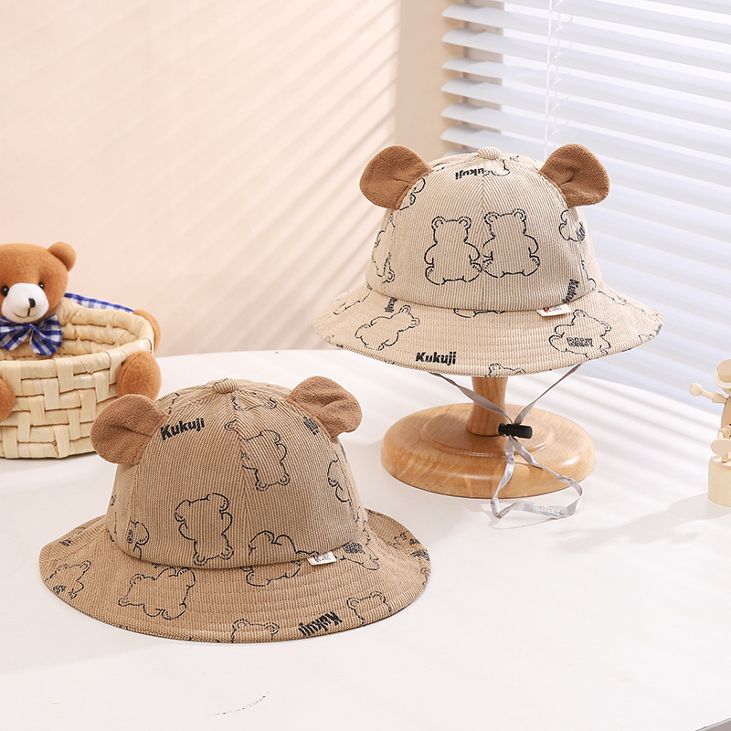 赤ちゃんの帽子秋冬韓国版漁師の帽子のプリントの熊の耳の子供の日よけの帽子のコーデュロイの赤ちゃんの盆の帽子