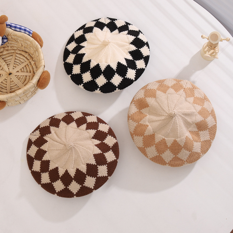道誉韓国の子供の帽子秋冬の韓国版の女性のダイヤモンドの格子のニットのベレーの帽子の復古の女の子の画家の帽子
