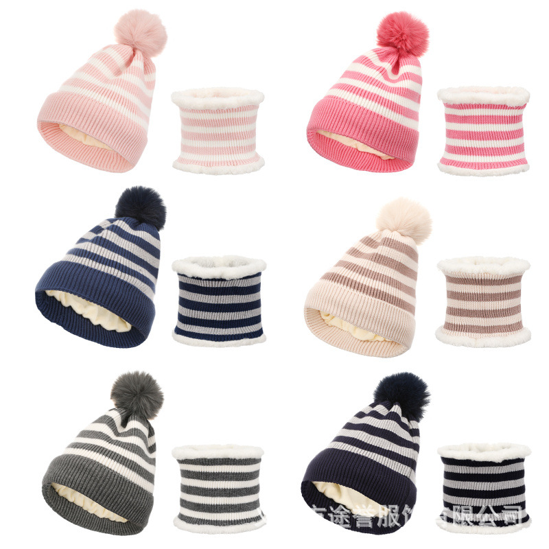 新型帽子マフラーセット冬ベルベット耳保護保温赤ちゃん冬帽子乳幼児防寒マフラー縞帽子