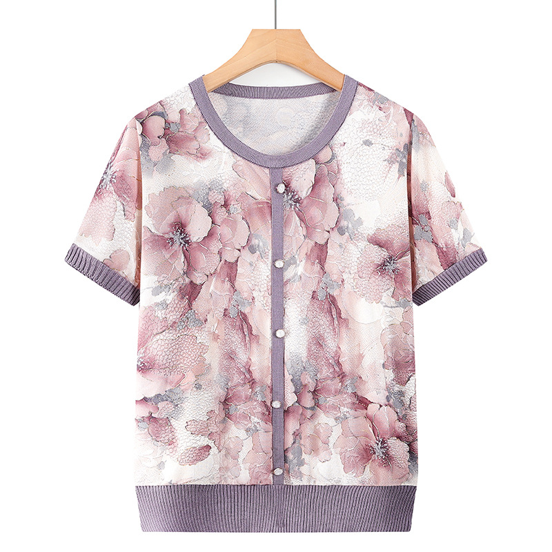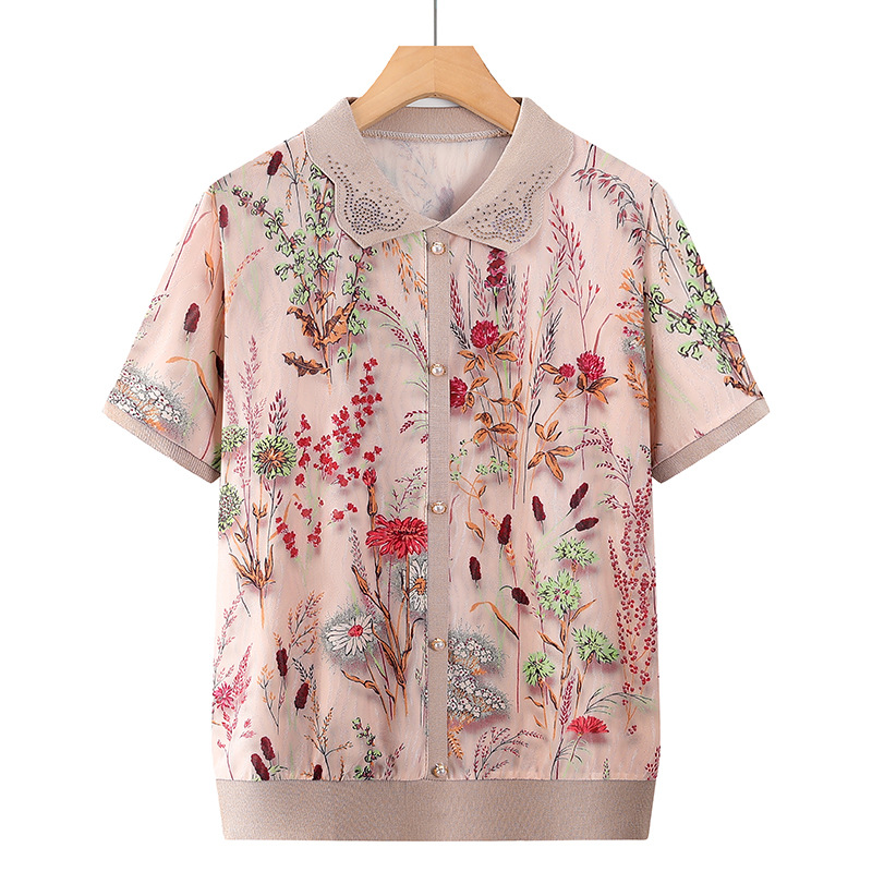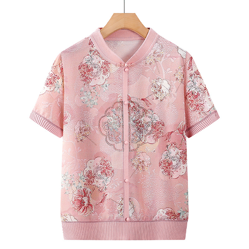 ママの夏半袖トップス、中高年綿スーツ、おしゃれママ半袖高齢者服、おばさん夏服