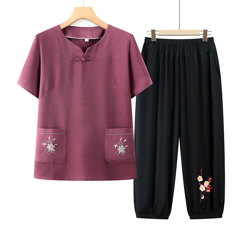 中高年のお母さんの服の綿麻のスーツのおばあさんの半袖の上着のおばあさんの服の夏服の2セットの中年の服の女性