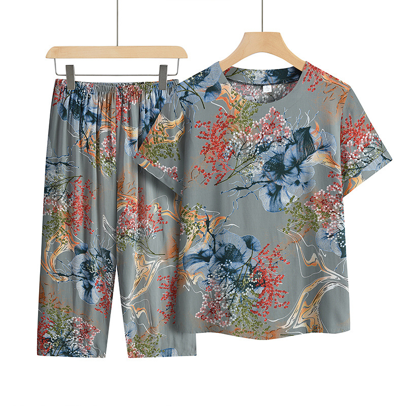 お母さんの服の夏のスーツ40-60歳の中高年の婦人服の半袖tシャツのプリントのスーツはカジュアルでゆったりしています。
