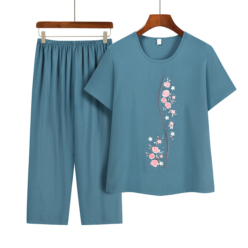 中高年夏服女性2点セットママ夏スーツ高齢者新半袖上着おばあちゃんカジュアル服