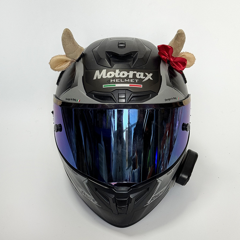 ヘルメットの装飾は光る悪魔の角の鹿の角のクリスマスの鹿の角を貼ってヘルメットの耳の牛の角を改造して装飾の装備に乗ります。